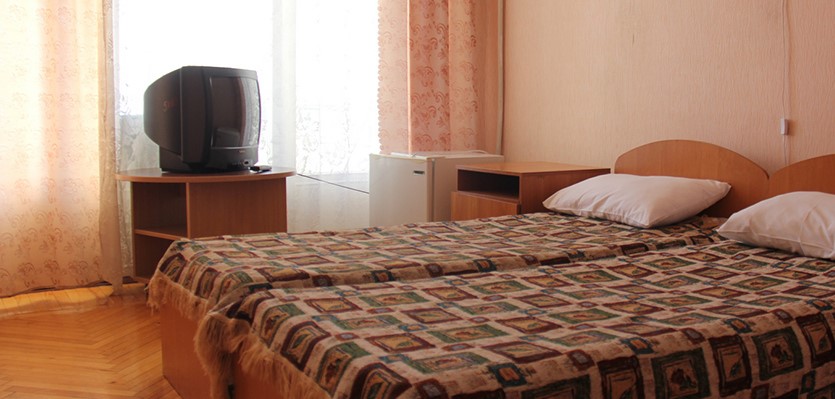 В номере: две односпальные кровати, платяной шкаф, прикроватные тумбы, туалетный столик, стулья, дополнительное место (раскладушка), набор посуды, холодильник, телевизор, кондиционер