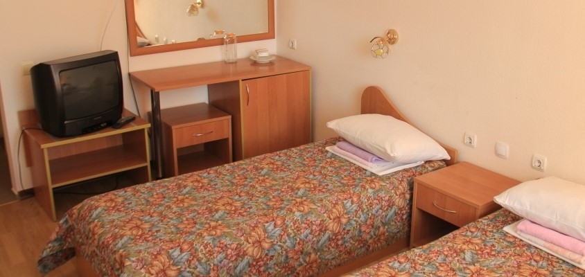 В номере: две односпальные кровати, платяной шкаф, прикроватные тумбы, туалетный столик, стулья, дополнительное место - кресло, набор посуды, холодильник, телевизор, кондиционер