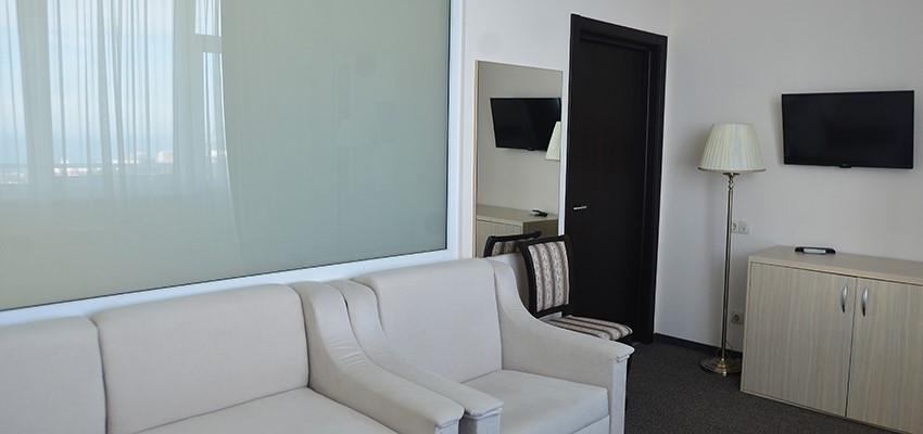 В номере: две комнаты: спальня и гостиная, две полутороспальные кровати, прикроватные тумбы, телевизор, холодильник, система климат-контроль, шкаф, письменный стол, диван, журнальный столик, чайник