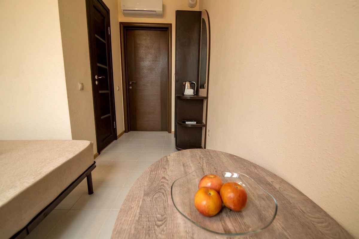 В номере: двуспальная кровать или две односпальные, прикроватные тумбы, стол, шкаф для одежды, кондиционер, ЖК телевизор, Wi-Fi, холодильник, электрочайник
