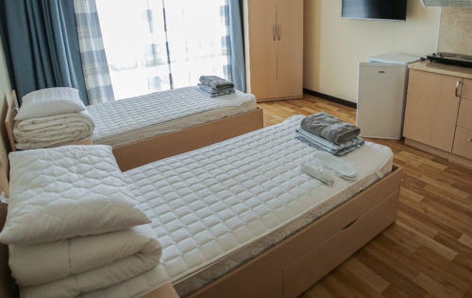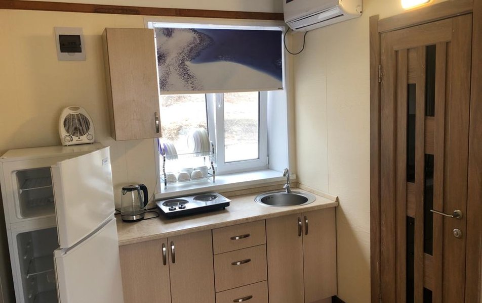 В номере: кровати односпальные /одна двуспальная кровать, кровать двухъярусная, кухонная мебель, прикроватные тумбочки, стол, стулья, мини-кухня, кондиционер, мини-холодильник, набор посуды, плита электрическая, телевизор, электрочайник