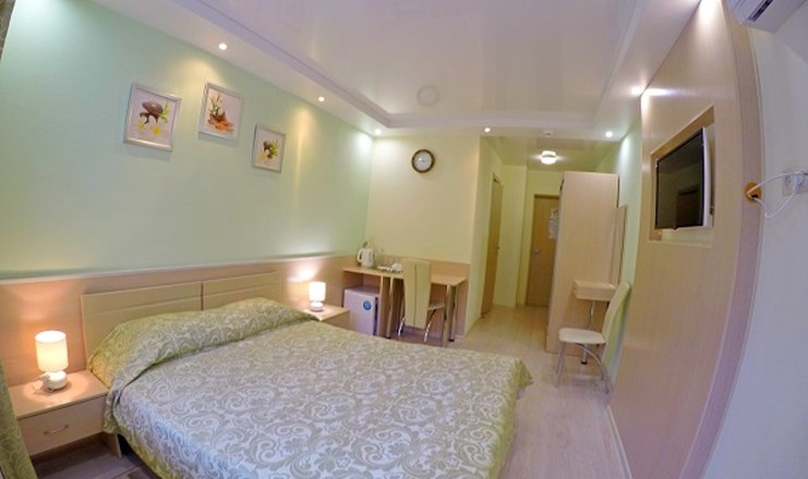 В номере: стол, 2 стула, журнальный столик, шкаф-купе, кондиционер, посуда, телевизор, холодильник, электрочайник, двуспальная кровать (ширина 160 см).
